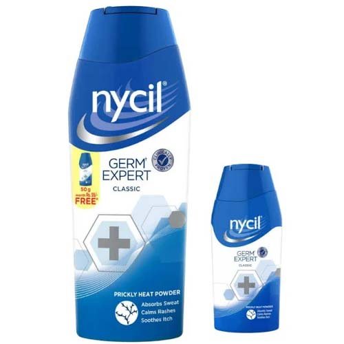 Stay cool, fresh, and protected with Nycil Germ Expert Classic Powder. Specially formulated with germ-fighting ingredients, it helps prevent prickly heat, rashes, and skin infections while absorbing excess sweat.