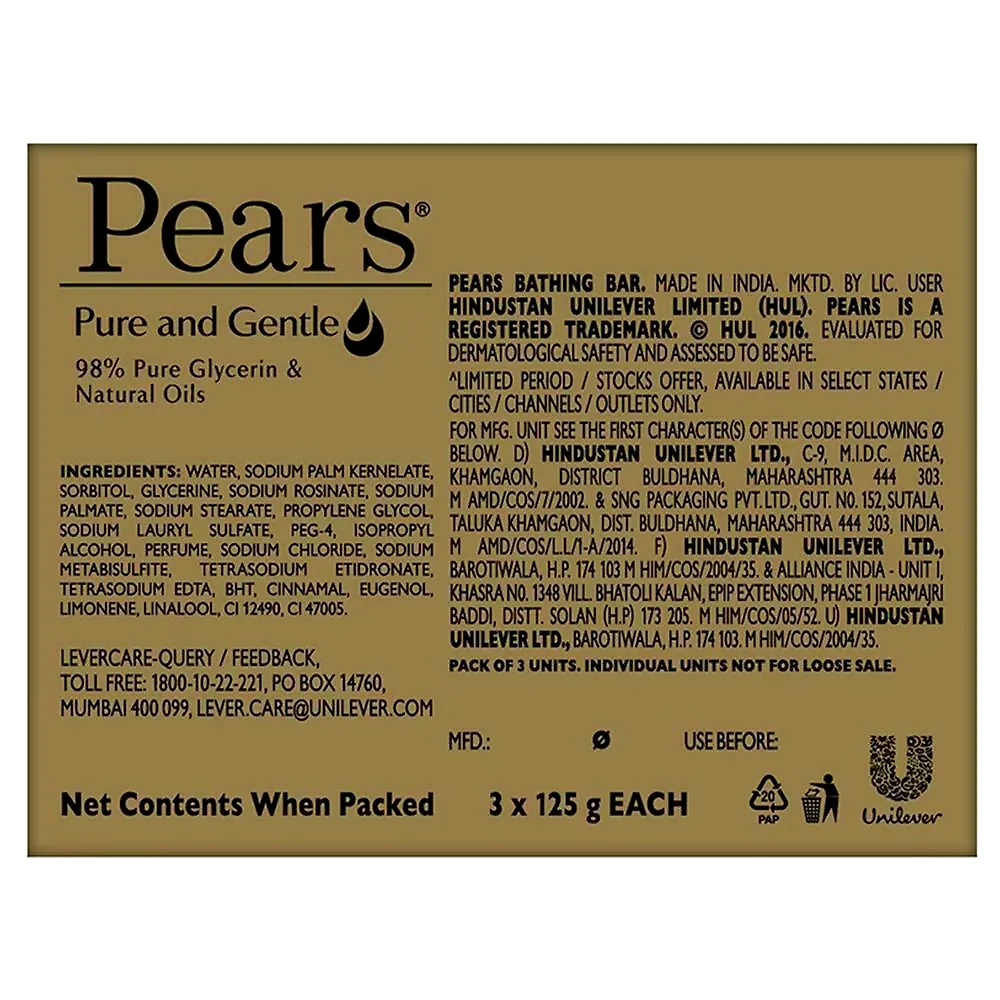 Pears Pure & Gentle Soap is a transparent, glycerin-based soap that is specially crafted to be mild and gentle on your skin. Enriched with natural oils and 98% pure glycerin, it helps retain your skin’s natural moisture, making it soft, smooth, and glowing. Its gentle cleansing formula is suitable for all skin types, including sensitive skin, and is ideal for daily use